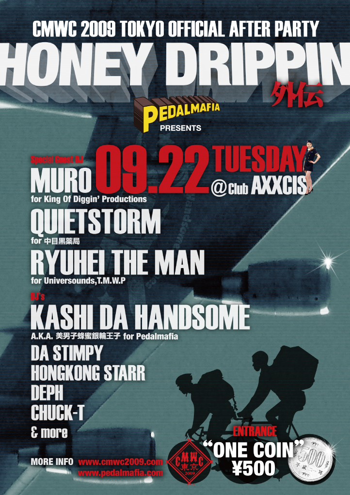 HONEY DRIPPIN'外伝のフライトスケジュールが 機長から発表されました! 以下、機長より ![]() アテンションプリーズ☆ついに2009年、満を持して東京で開催される、1993年より毎年世界の都市を巡って開催されてきた、プロのチャリンコメッセンジャーたちの世界大会・"CMWC 2009 TOKYO〜"☆9/22 (Tue)は、その"CMWC"の2DAYSのオフィシャルアフターパーティーの一晩目のとして、JR渋谷駅南口すぐの、CLUB AXXCISにて、PEDALMAFIA, HANDSOME AIR LINESプレゼンツ・"HONEY DRIPPIN' 外伝"が一晩限りの特別就航をいたします。 「銀輪メッセンジャー世界大会のアフターパーティーは、クレイツディガーの世界大会☆呑んで踊って騒ごうぜい♪」と、ジャンルの壁なんか軽くまたいじゃう、昼のレースに引けを取らないビッグなDJたちが、世界のグッドミュージックで夜の東京を大きく揺らします☆ 想いを寄せるアノ人と・やっぱり気の合う友達同士で・はたまた気楽にお一人様で、どうぞお気軽にご搭乗ください☆良質な音楽と美味しいお酒は、きっと二人の距離を一気に縮めてくれるハズ♪ 9月22日(Tue)も貴女を酔わせる音楽と、とびきりのメチャんこカワゆいハンサムハニーアテンダント達と・機長と愉快な仲間たちが一晩エスコートさせていただきます。皆様のご搭乗、お待ちしております。 テンキュー ----- 2009/09/22 (Tuesday) @CLUB AXXCIS CMWC 2009 TOKYO OFFICIAL AFTER PARTY PEDALMAFIA PRESENTS:銀輪納涼夏祭り☆1日目 "HONEY DRIPPIN' ザ・外伝" 『銀輪世界大会のアフターパーティーは、 クレイツディガーの世界大会☆呑んで踊ってお祭りだい♪』 SPECIAL GUEST DJ: MURO for KING OF DIGGIN' PRODUCTIONS QUIETSTORM for 中目黒薬局 RYUHEI THE MAN for UNIVERSOUNDS DJ: KASHI DA HANDSOME for PEDALMAFIA DA STIMPY HONGKONG STARR DEPH CHUCK-T and more ENTRANCE: ONLY ONE COIN / 500YEN MORE INFO: www.cmwc2009.com www.pedalmafia.com ----- Posted by pedalmafia at