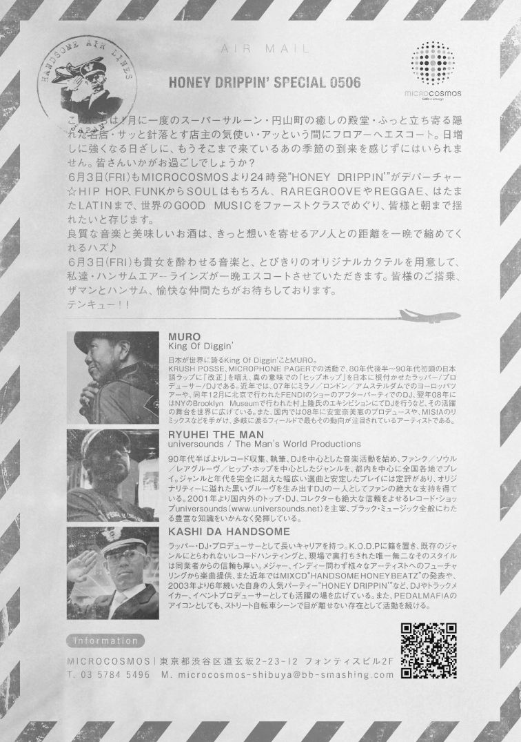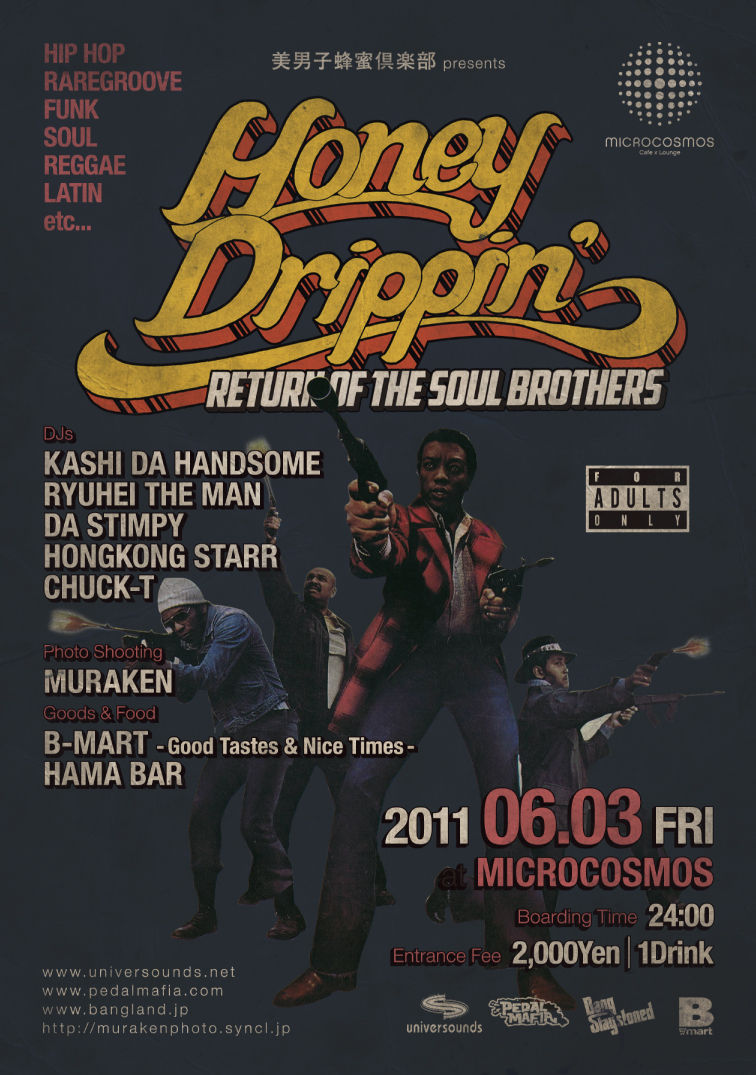 みなさんぜひあそびにきてくださーい♪ ![]() ![]() HONEY DRIPPIN' ~Return of The Soul Brothers~ 2011/06/03 (FRI) OPEN:24:00~ ENTRANCE:2,000YEN /1DRINK DJs: KASHI DA HANDSOME RYUHEI THE MAN DA STIMPY HONGKONG STARR CHUCK-T PHOTO SHOOTING: MURAKEN GOODS & FOOD: B-MART ~Good Tastes & Nice Times~ GENRE: HIPHOP, RAREGROOVE, FUNK, SOUL, RAGGAE, LATIN, etc... More Info: http://www.microcosmos-tokyo.com/ http://www.universounds.net/ http://kinginc.co.jp/blog/ryuhei/ http://murakenphoto.syncl.jp/ http://www.bangland.jp/ http://twitter.com/#!/BANGSTAYSTONED ----- 月に一度のスーパーサルーン・円山町の癒しの殿堂・ふっと立ち寄る隠れた名店・サッと針落とす店主の気使い・アッという間に雲の上。梅雨に入りはっきりしないお天気が続きますが、皆さんいかがお過ごしでしょうか? 6月3日(FRI)もMICRO COSMOSより24時発"HONEY DRIPPIN'"がデパーチャー☆梅雨空の雲の上、HIP HOP、FUNKからSOULはもちろん、RAREGROOVEやREGGAE、はたまたLATINまで、世界のGOOD MUSICをファーストクラスでめぐり、皆様と朝まで揺れたいと存じます。 良質な音楽と美味しいお酒は、きっと想いを寄せるアノ人との距離を一晩で縮めてくれるハズ♪ 6月3日(FRI)も貴女を酔わせる音楽と、とびきりのオリジナルカクテルを用意して、私達・ハンサムエアーラインズが一晩エスコートさせていただきます。皆様のご搭乗、ザマンとハンサム、愉快な仲間たちがお待ちしております。 テンキュー ----- Posted by pedalmafia at