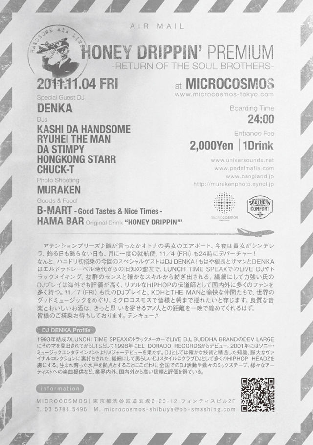 11/7(FRI)も氏のDJプレイと、KDHとザマンと愉快な仲間たちで、世界のグッドミュージックをめぐり、ミクロコスモスで皆様と朝まで揺れたいと存じます。良質な音楽とおいしいお酒は、きっと思 いを寄せるアノ人との距離を一晩で縮めてくれるはず。皆様のごご搭乗お待ちしております。