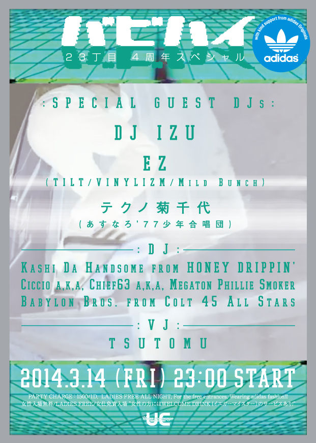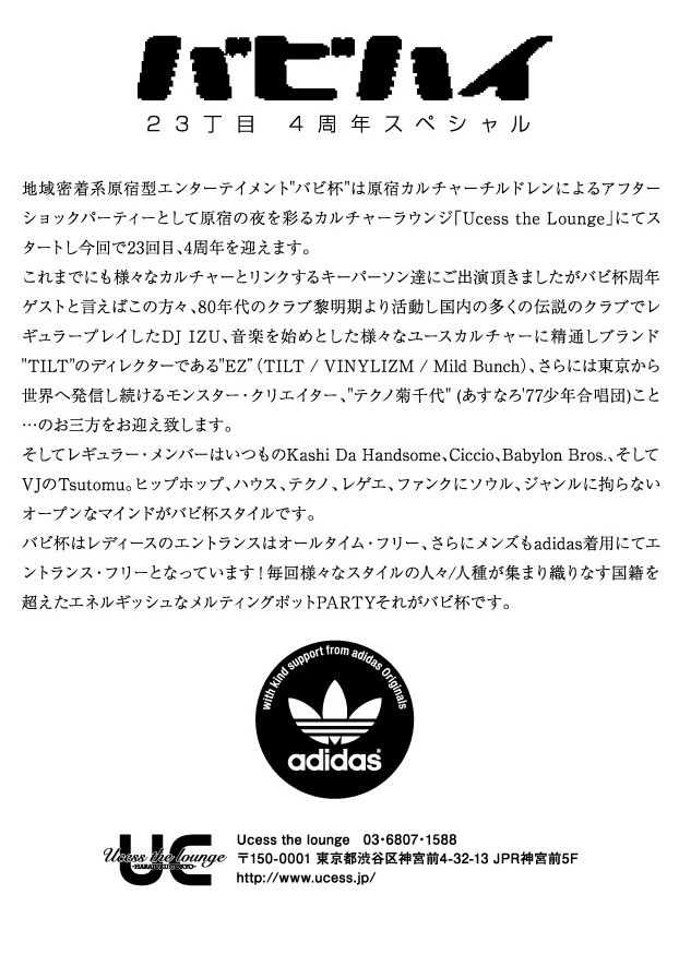 地域密着系原宿型エンターテイメント"バビ杯"は原宿カルチャーチルドレンによるアフターショックパーティーとして原宿の夜を彩るカルチャーラウンジ「Ucess the Lounge」にてスタートし今回で23回目、4周年を迎えます。これまでにも様々なカルチャーとリンクするキーパーソン達にご出演頂きましたがバビ杯周年ゲストと言えばこの方々、80年代のクラブ黎明期より活動し国内の多くの伝説のクラブでレギュラープレイしたDJ IZU、音楽を始めとした様々なユースカルチャーに精通しブランド"TILT"のディレクターである"EZ”(TILT / VINYLIZM / Mild Bunch)、さらには東京から世界へ発信し続けるモンスター・クリエイター、"テクノ菊千代" (あすなろ'77少年合唱団)こと…のお三方をお迎え致します。そしてレギュラー・メンバーはいつものKashi Da Handsome、Ciccio、Babylon Bros.、そしてVJのTsutomu。ヒップホップ、ハウス、テクノ、レゲエ、ファンクにソウル、ジャンルに拘らないオープンなマインドがバビ杯スタイルです。バビ杯はレディースのエントランスはオールタイム・フリー、さらにメンズもadidas着用にてエントランス・フリーとなっています!毎回様々なスタイルの人々/人種が集まり織りなす国籍を超えたエネルギッシュなメルティングポットPARTYそれがバビ杯です。